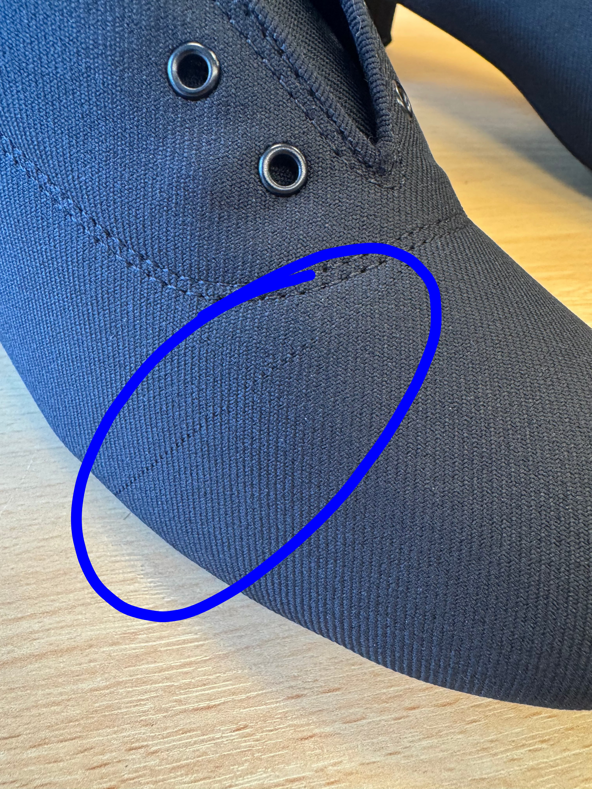 Factory Reject: Pulled thread on right shoe, as seen in photo