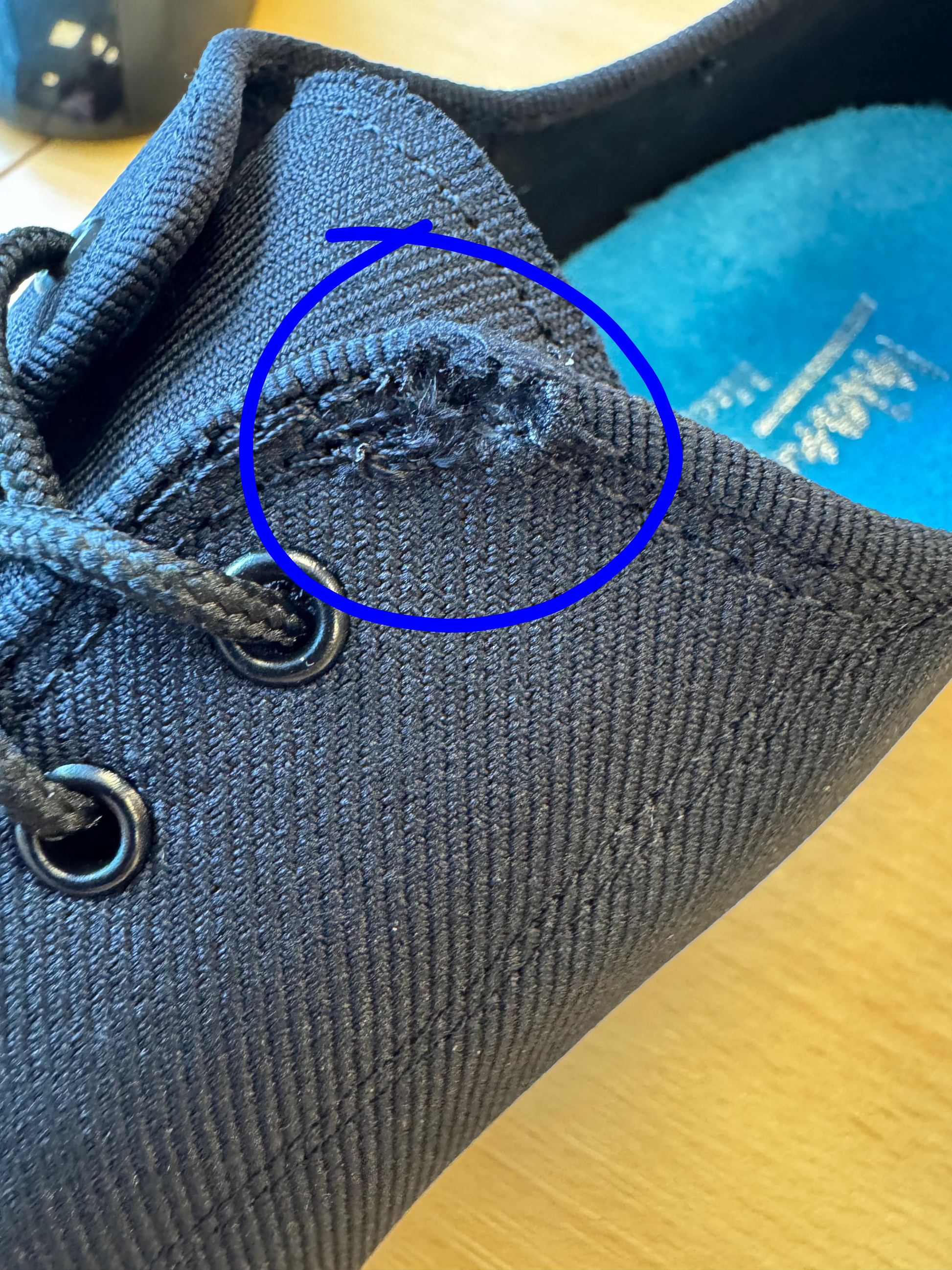 Factory Reject: Pulled thread on the left foot/ binding damaged on the right foot, as seen in photo