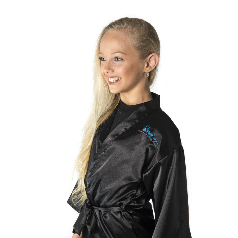 The Kimono is super soft and extremely lightweight and comfortable. It's perfect for wear in and around the Ballroom, at practice and even at home. Modelled hear by Ella Perry, World & British Open Juvenile Champion! The Kimono for children has sleeves that are 35cm, a chest of 84cm (34") and the length is 76cm.