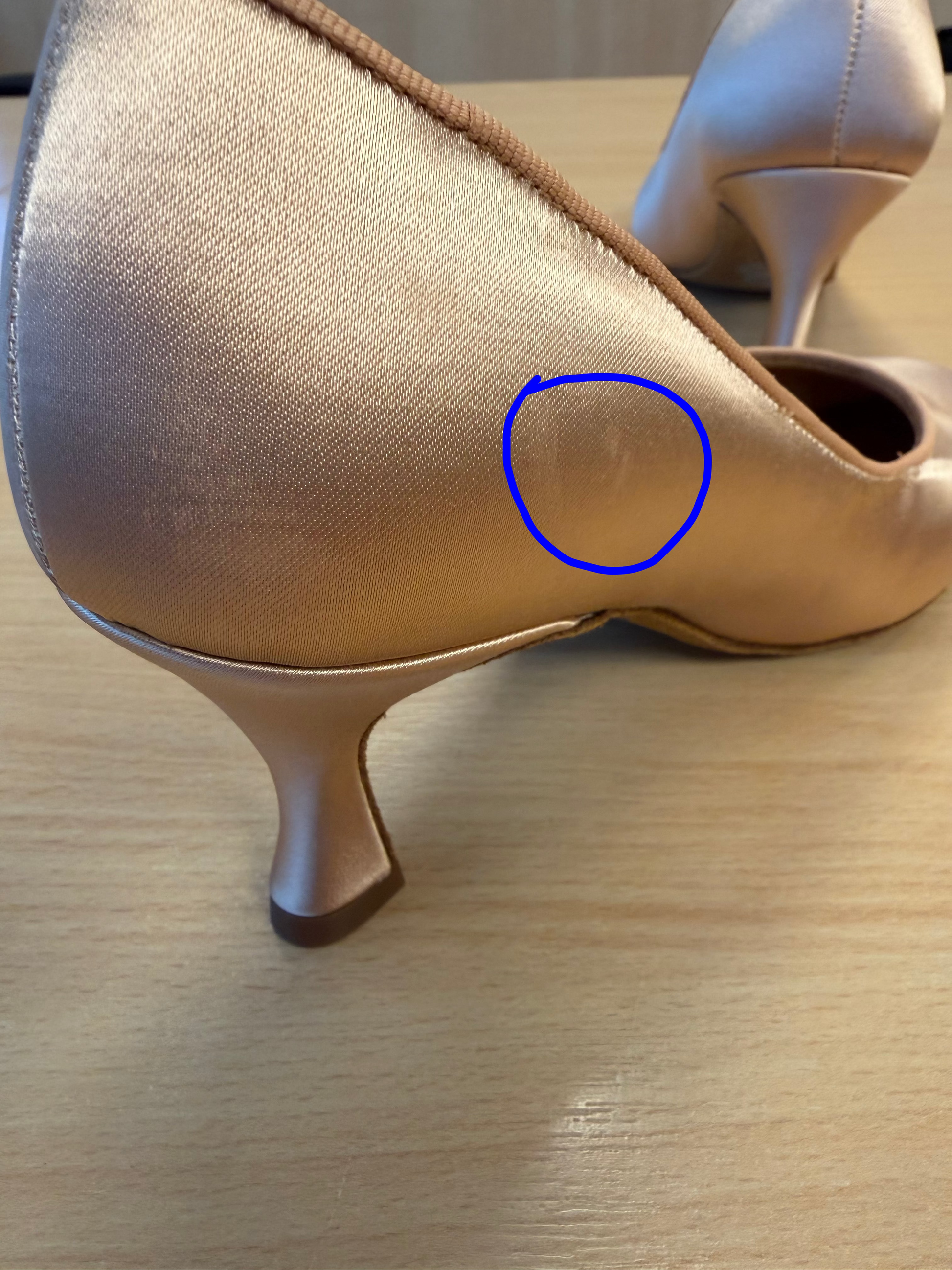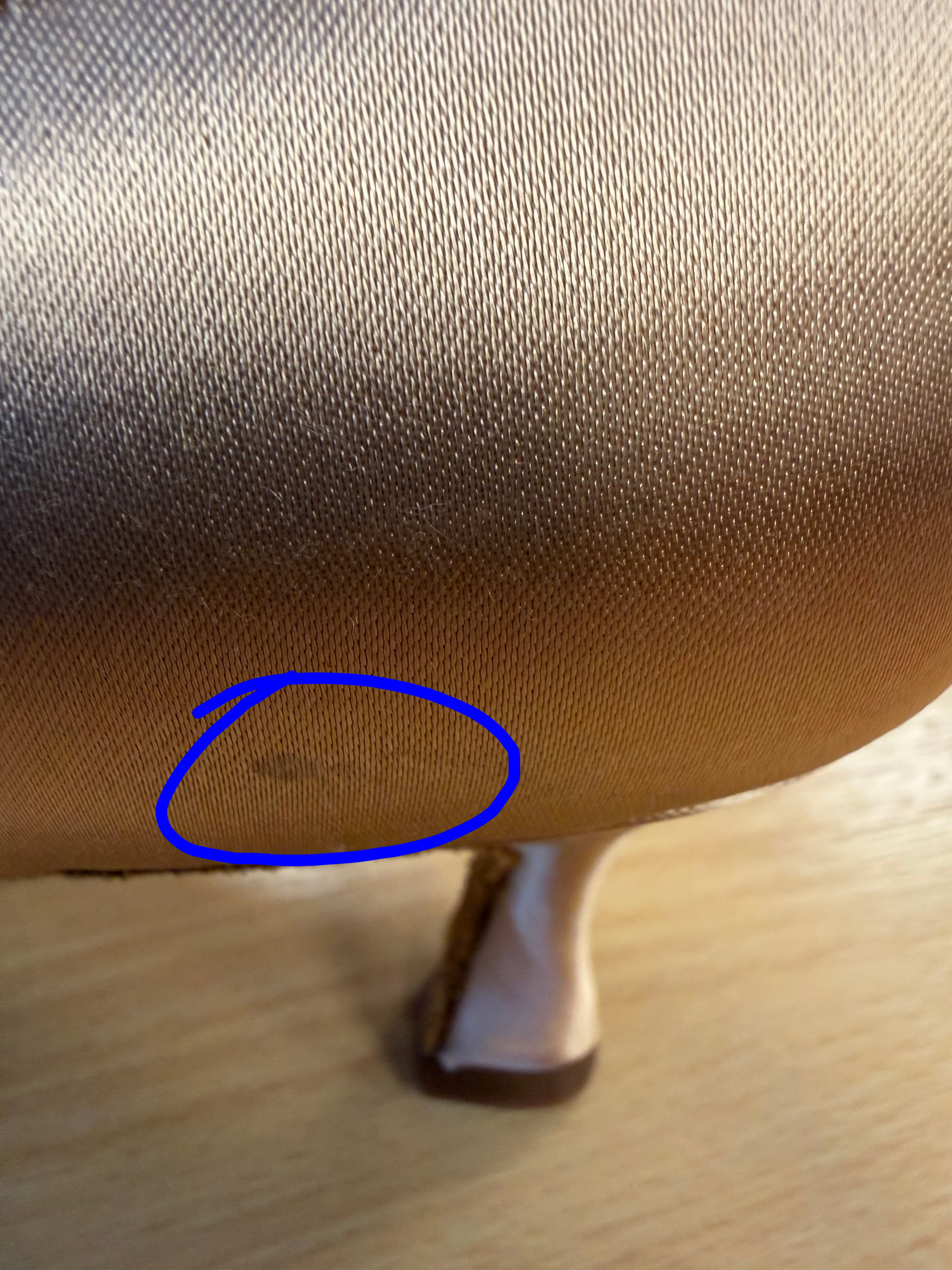 Factory reject: Glue stains on both, small damage on binding on the left foot, as seen in photo