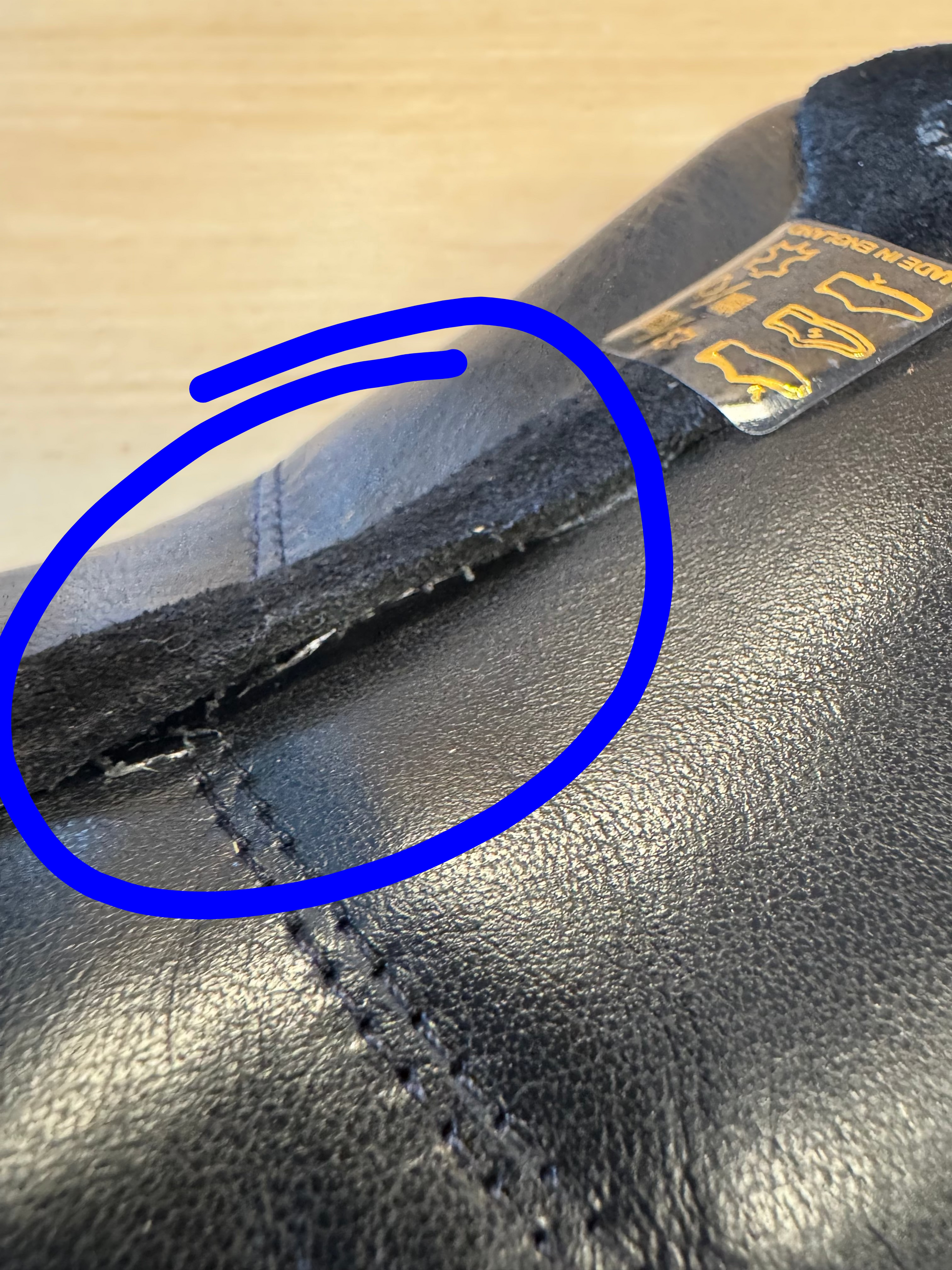 Factory Reject: Right foot- faulty leather/ missing glue on the sole, as seen in photo