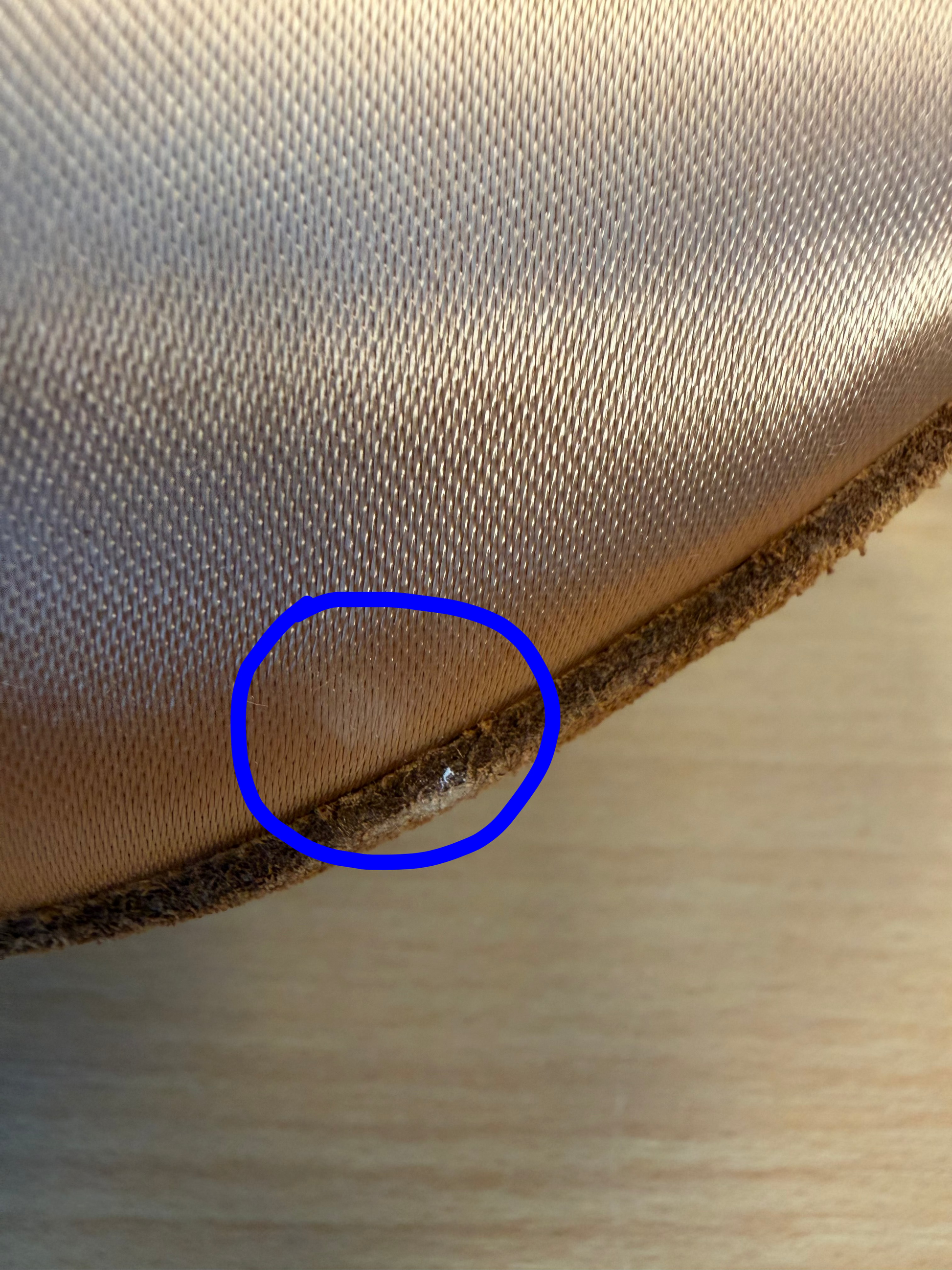 Factory reject: Tiny stain on the left, lumps and small scratch on the right foot, as seen in photo