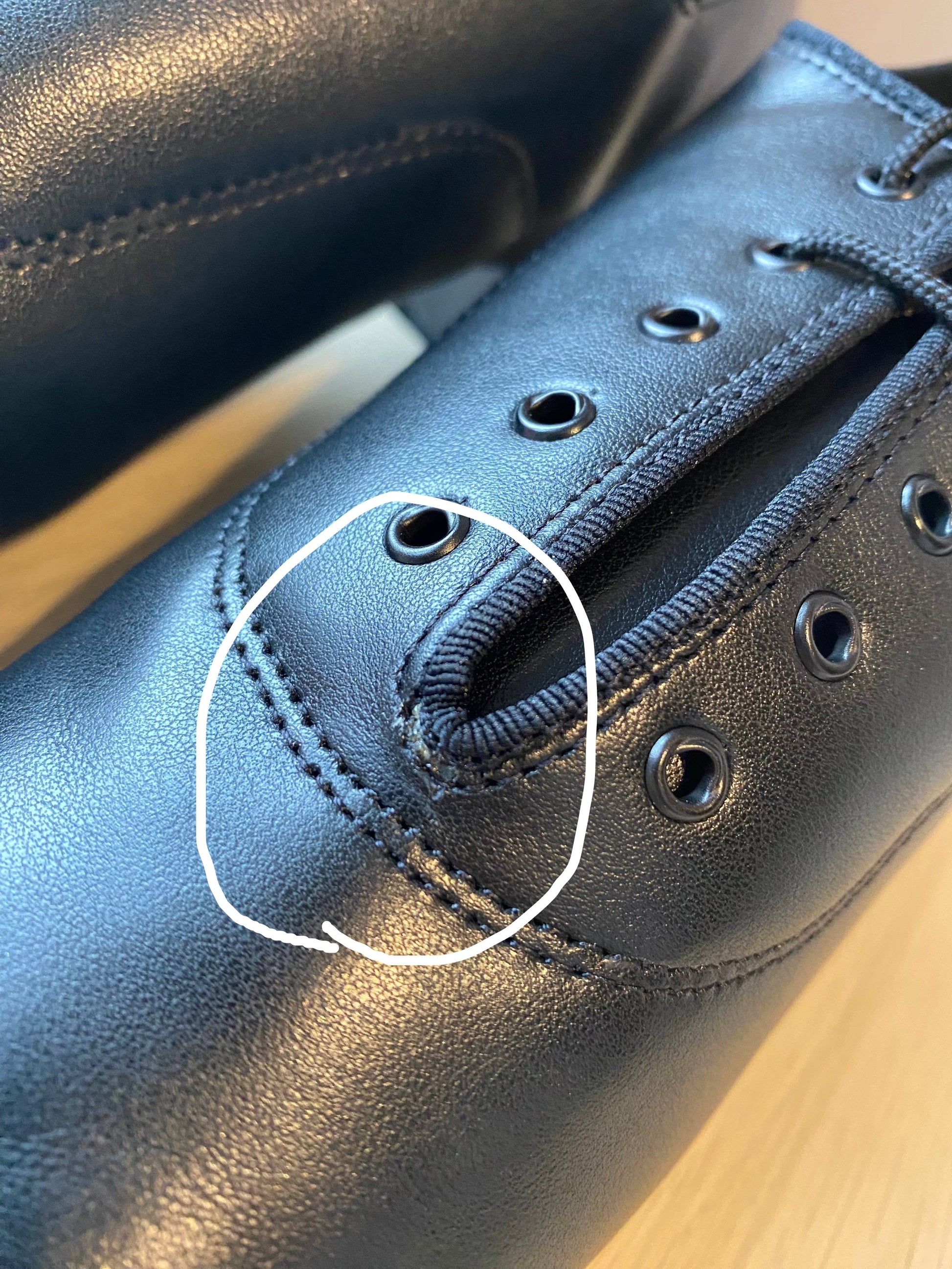 Fault: Scratch in the fabric on the outside upper of the right shoe and rip under the binding on the front left shoe (pictured)