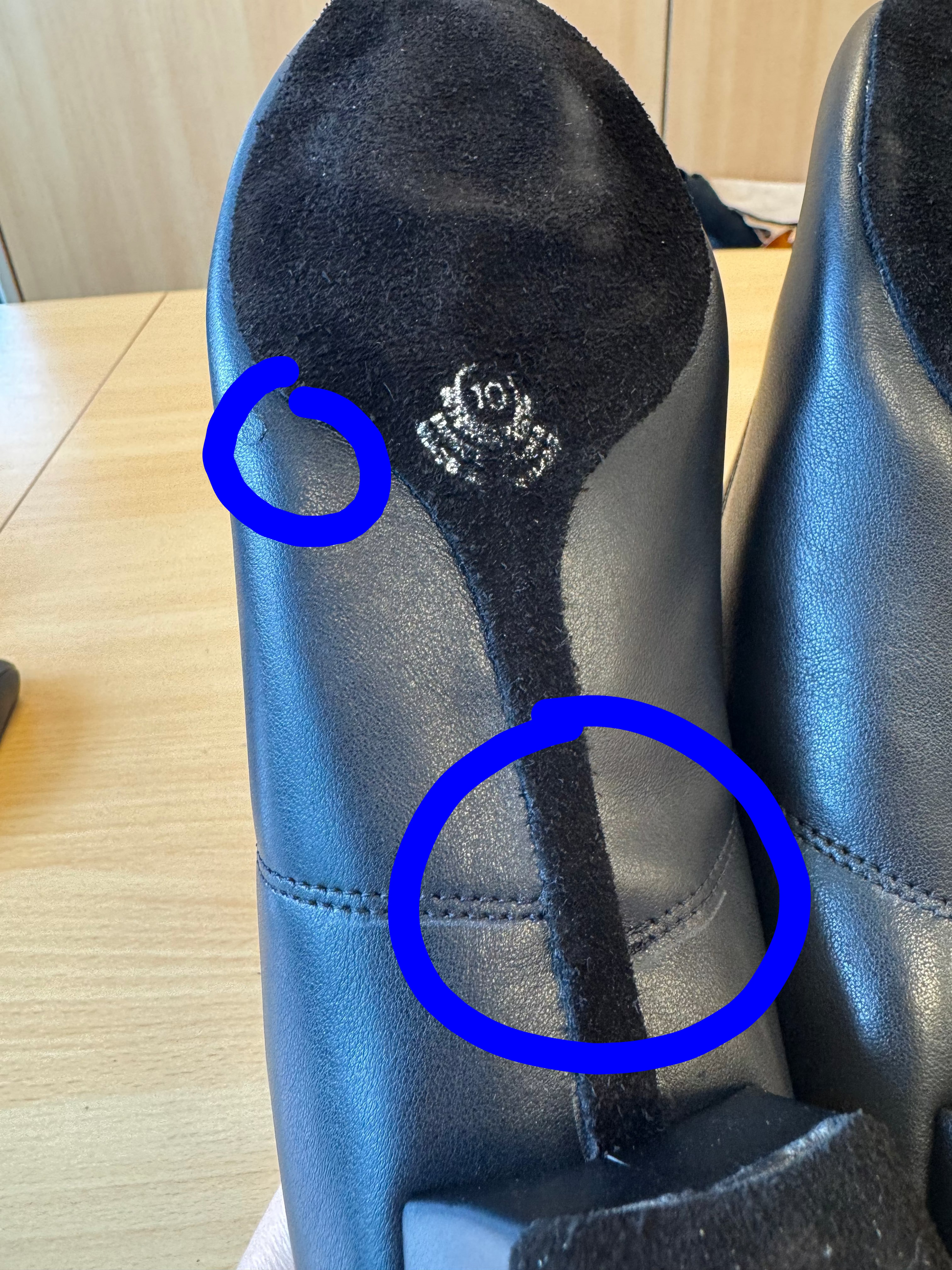 Factory Reject: Tiny lump and uneven closing on right shoe, as seen in photo